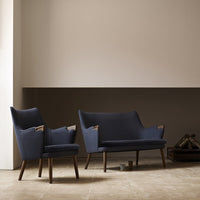 The CH72 Sofa is characterized by a slim, fully upholstered frame, loose cushions, and round, tapered legs in solid wood.