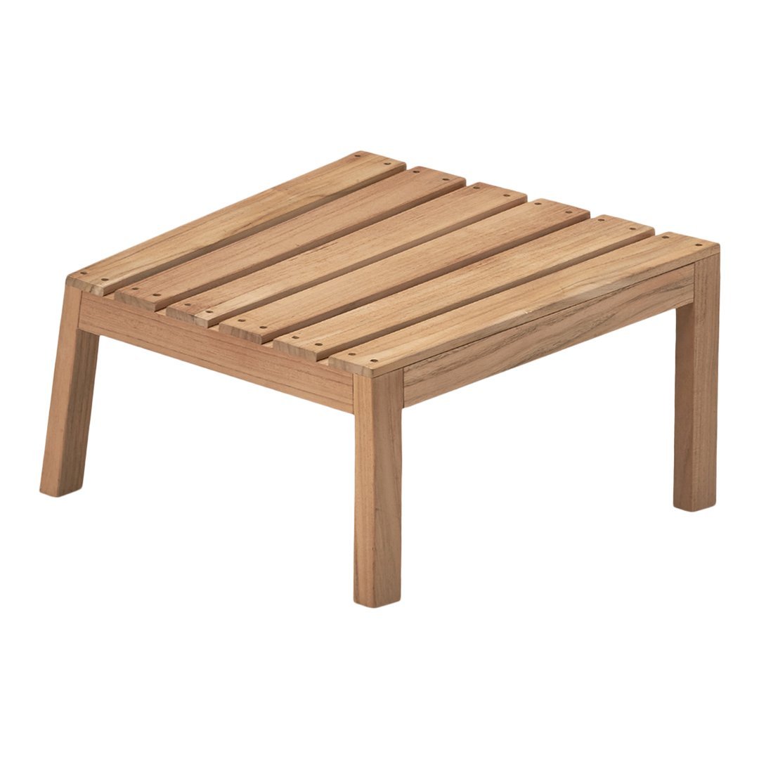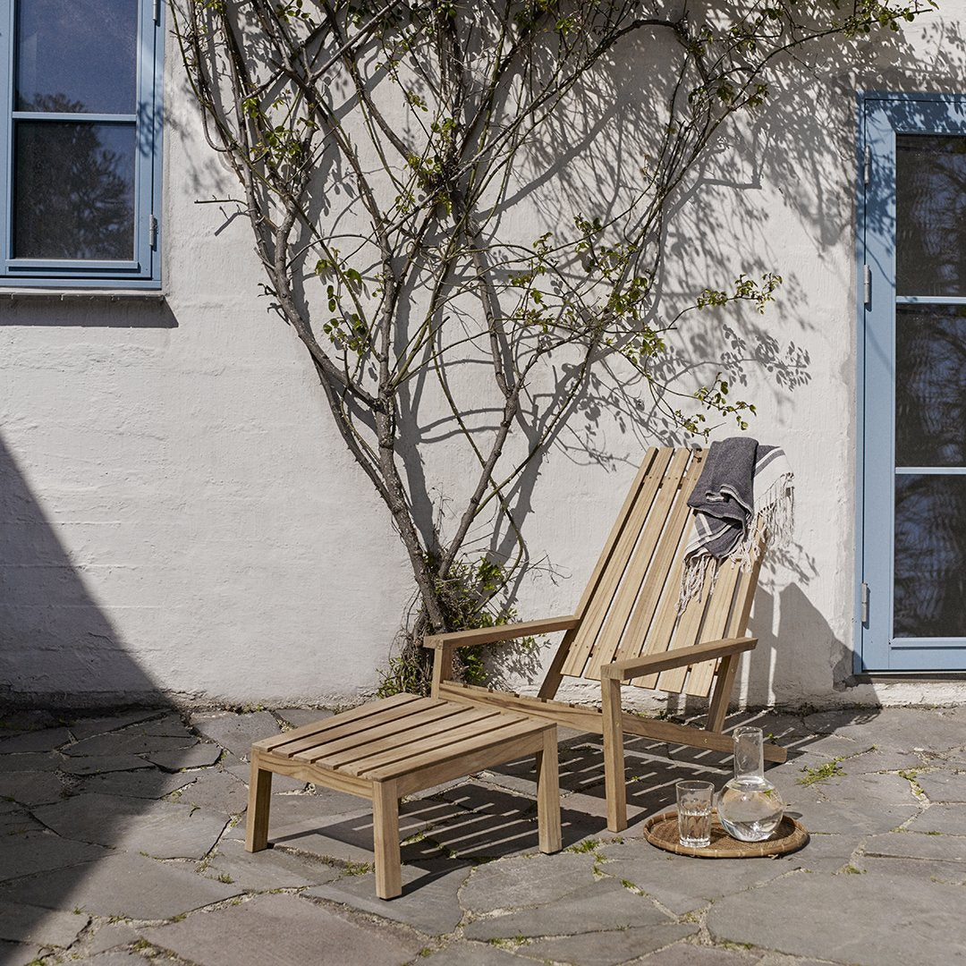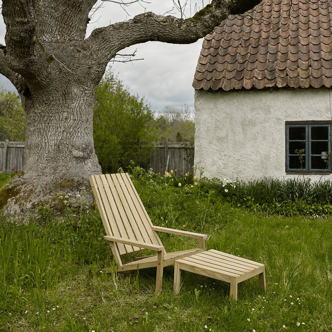 Between Lines deck stool functions as an extension to the deck chair and slopes downward just a bit, enough to give the legs a feeling of being supported in a natural composition. The design is inspired by the classic Adirondack deck chair, and balances between an American sturdiness and a tight, Scandinavian expression.