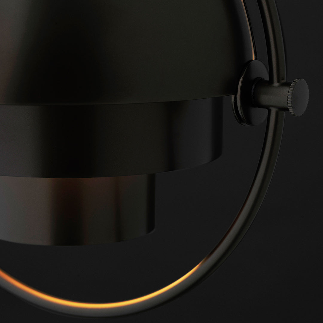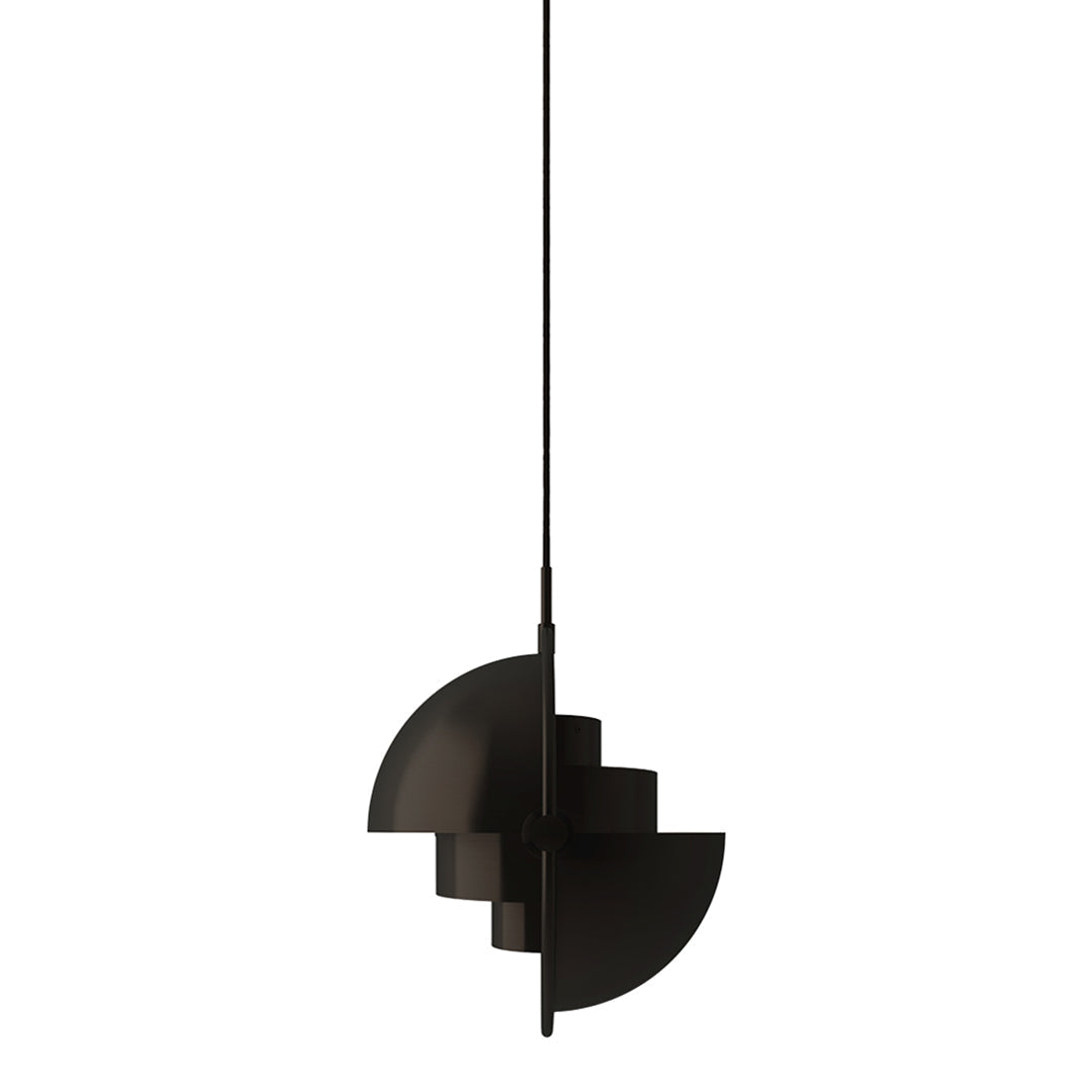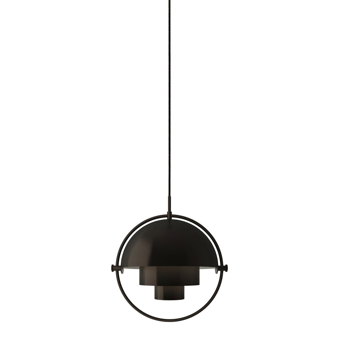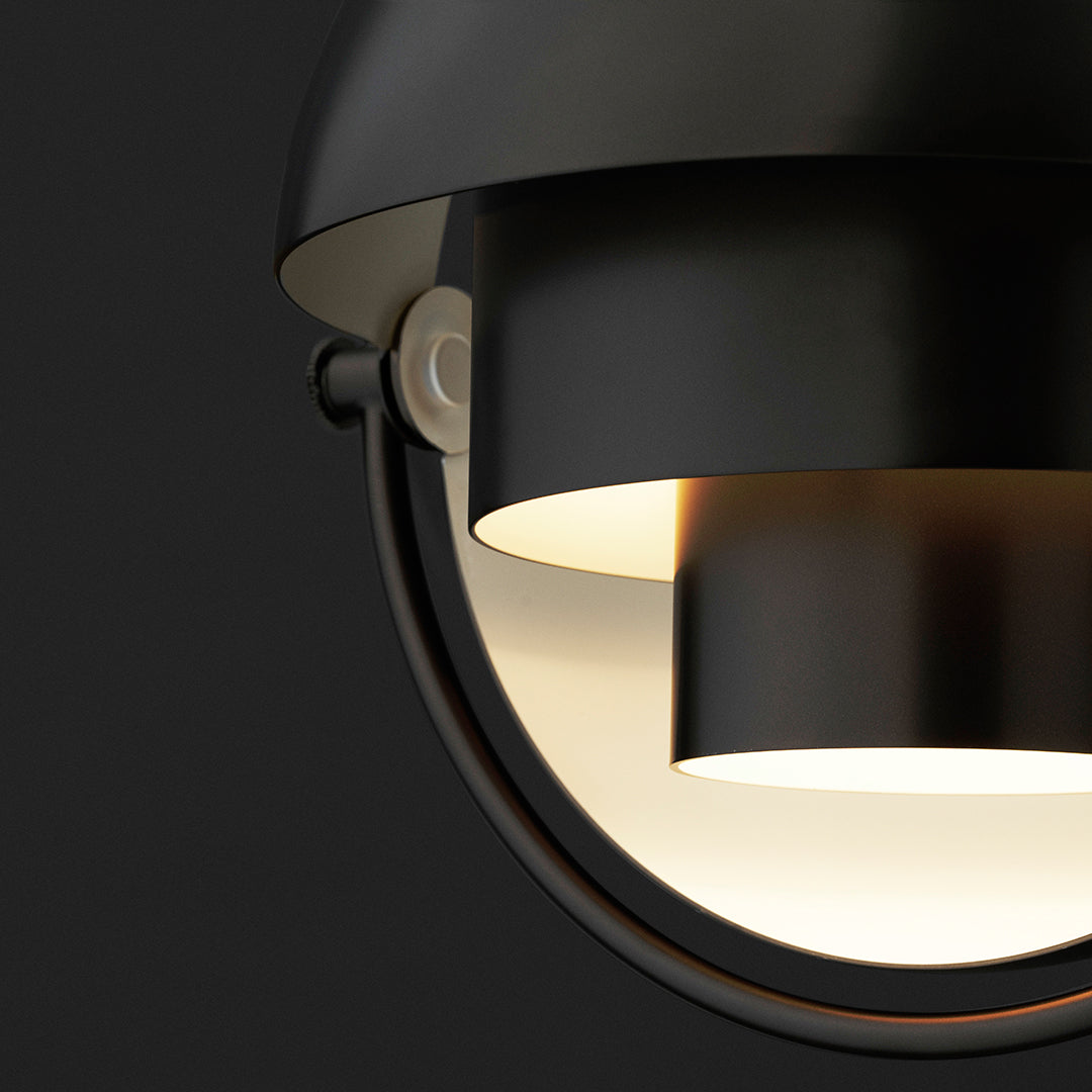 The Multi-Lite Pendant embraces the golden era of Danish design with its characteristic shape of two opposing outside, mobile shades that enable creating a personal installation and a wide range of lighting values in a room. By individually rotating the shades, the Multi-Lite Pendant can be transformed into multiple combinations where the light can be directed upwards, downwards or exude an asymmetrical art light. The Multi-Lite was first drawn in 1972 when Louis Weisdorf did an exception to his own design custom of using multiple repeating elements. Instead, it reflects his passion for diversity. Two cylindrical shapes lay the foundation of the lamp and a metal ring encompasses it and anchors the two quarter-spherical shades, which ultimately completes a picture of an iconic design with multiple purposes. The Multi-Lite Pendant has a timeless expression that fits into any domestic setting.