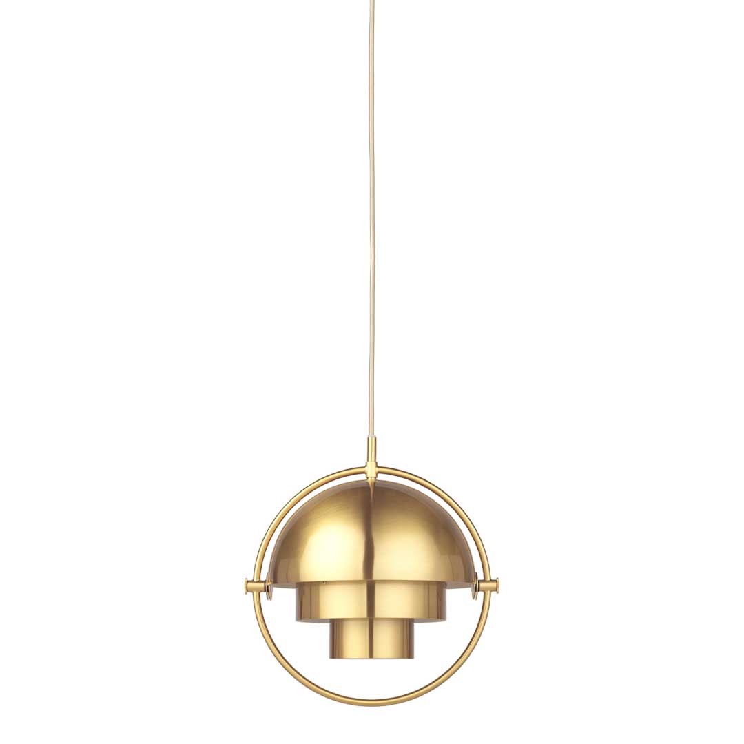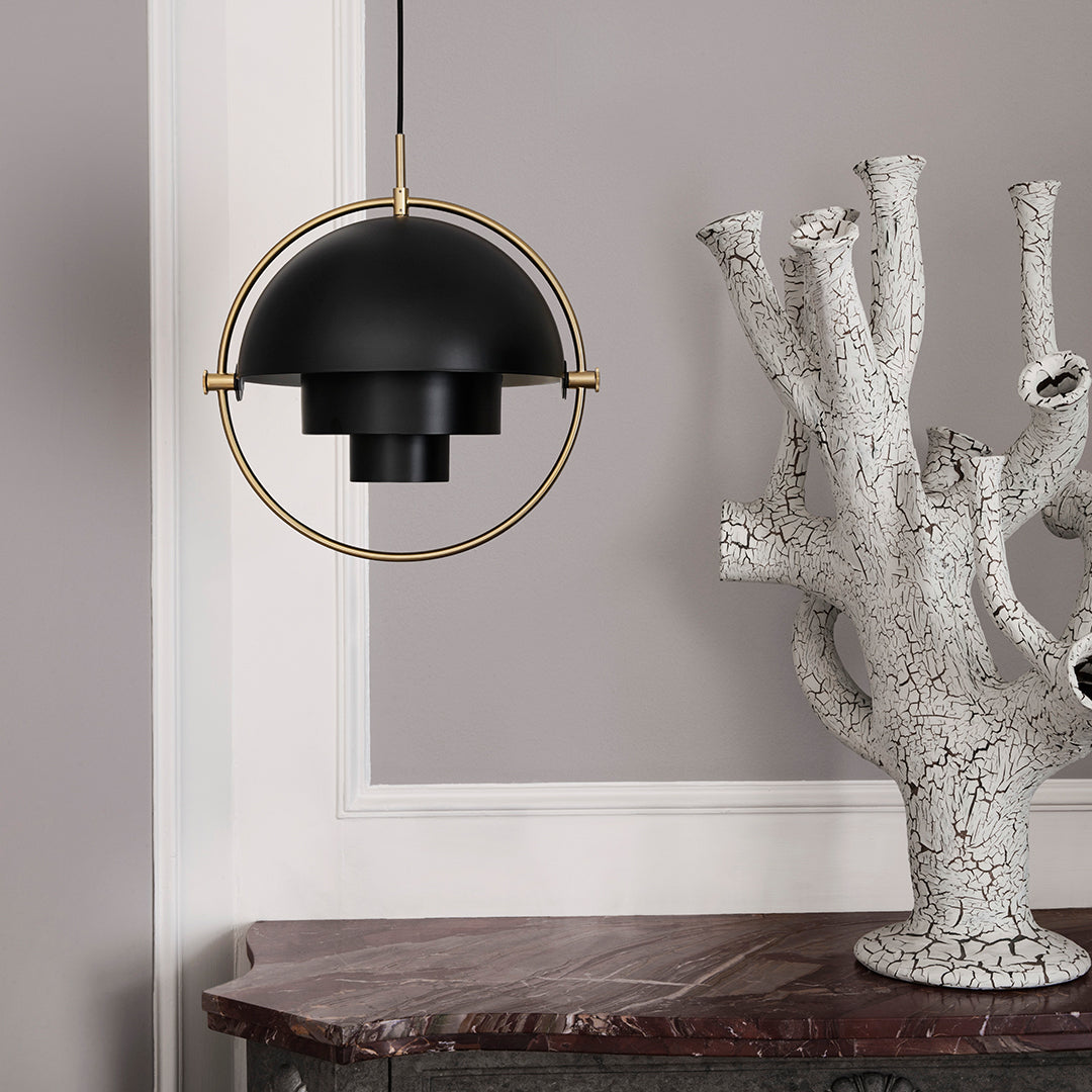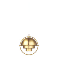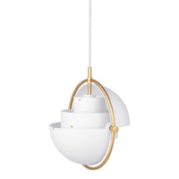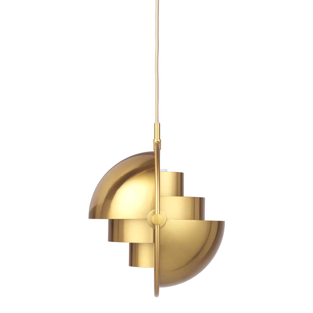 The Multi-Lite Pendant embraces the golden era of Danish design with its characteristic shape of two opposing outside, mobile shades that enable creating a personal installation and a wide range of lighting values in a room. By individually rotating the shades, the Multi-Lite Pendant can be transformed into multiple combinations where the light can be directed upwards, downwards or exude an asymmetrical art light. The Multi-Lite was first drawn in 1972 when Louis Weisdorf did an exception to his own design custom of using multiple repeating elements. Instead, it reflects his passion for diversity. Two cylindrical shapes lay the foundation of the lamp and a metal ring encompasses it and anchors the two quarter-spherical shades, which ultimately completes a picture of an iconic design with multiple purposes. The Multi-Lite Pendant has a timeless expression that fits into any domestic setting.