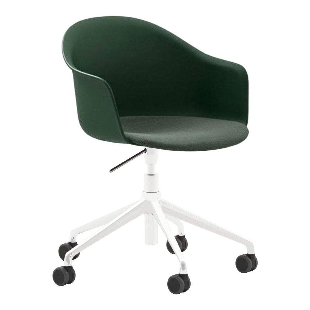 Mani Plastic Armshell Armchair - Milk Painted Aluminum 5-Star Base w/ Gas Lift & Casters - Seat Upholstered