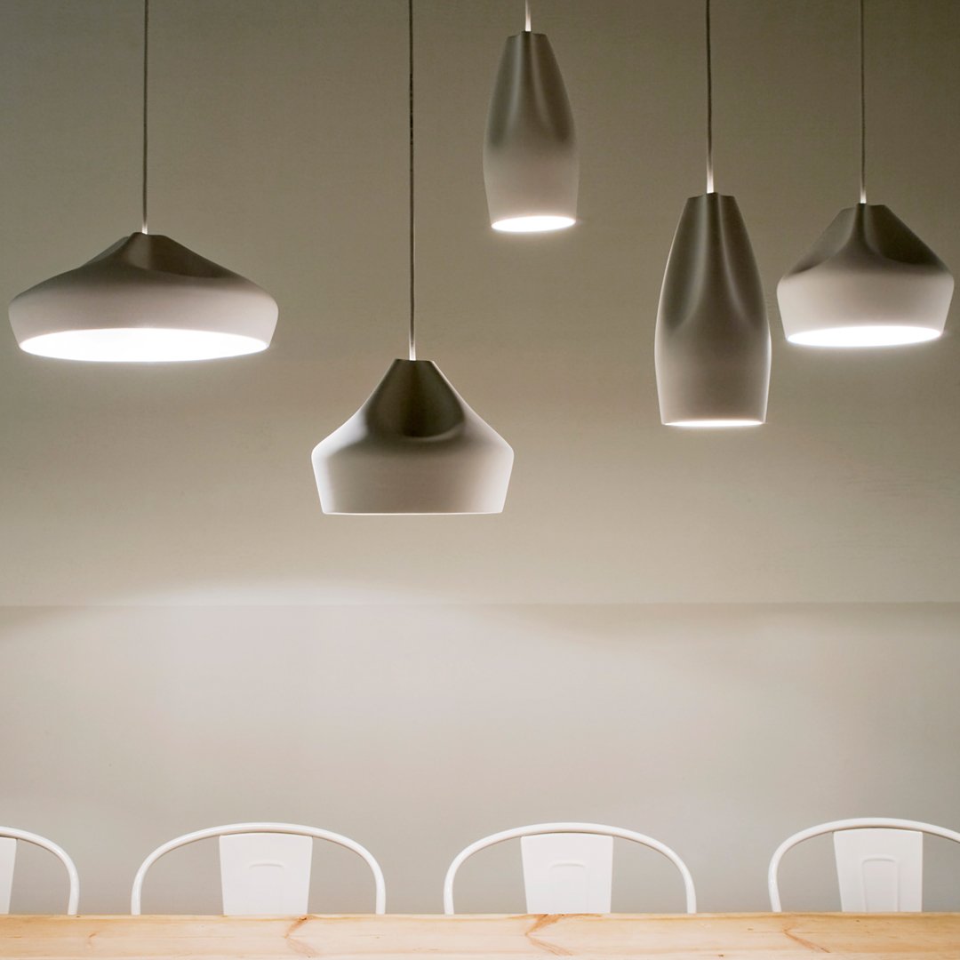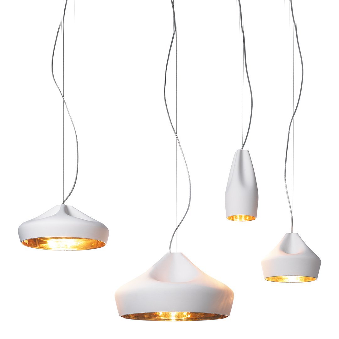 The outer part of the lamp is offered in white ceramic, black, terracotta, and Grey– the direct result of recycling different enamels. The interior is available in brilliant white enamel, which enhances the luminous light from the lamp, or 24k gold, which generates an extremely warm light.