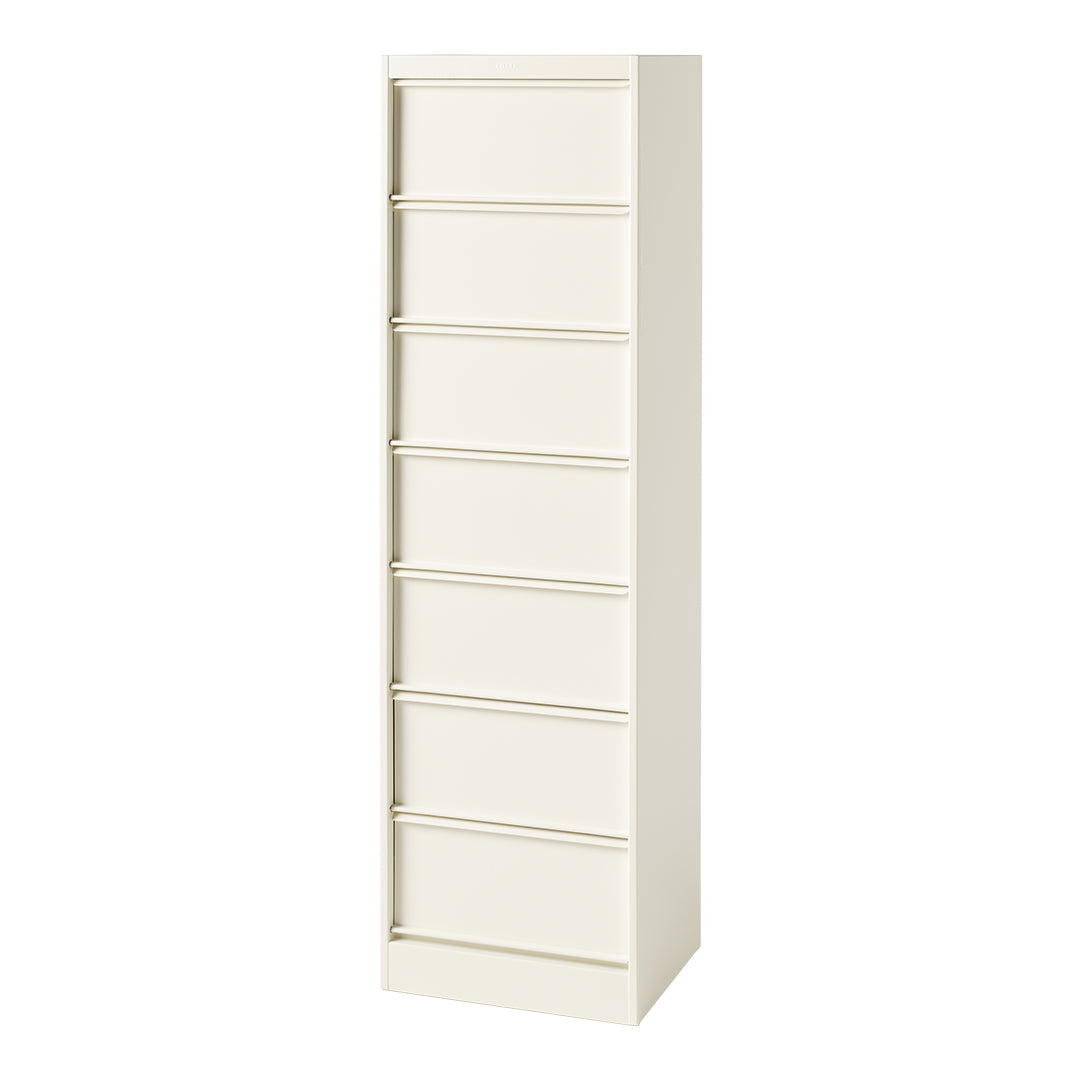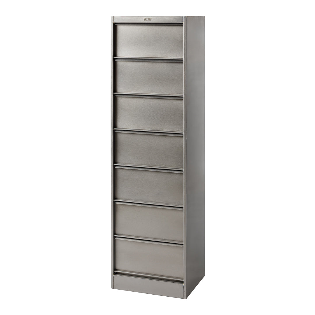 Designed by Xavier Pauchard in the 1930s for both industrial use as well as for public and private organizations, the Flap Cabinet has traveled through the years and fashions and is now a classic firmly etched in collective memory. Timeless, it has been readily accepted into the private sphere while retaining its status as an icon of industrial aesthetics. Embodying style from the 1930s through to the 1950s, this piece of furniture is robustly solid while also being very lightweight. Highly functional, it has three, five, seven or ten flap-covered shelves depending on the model chosen. Flaps open up 180 degrees and are drawn closed with magnets.
