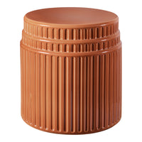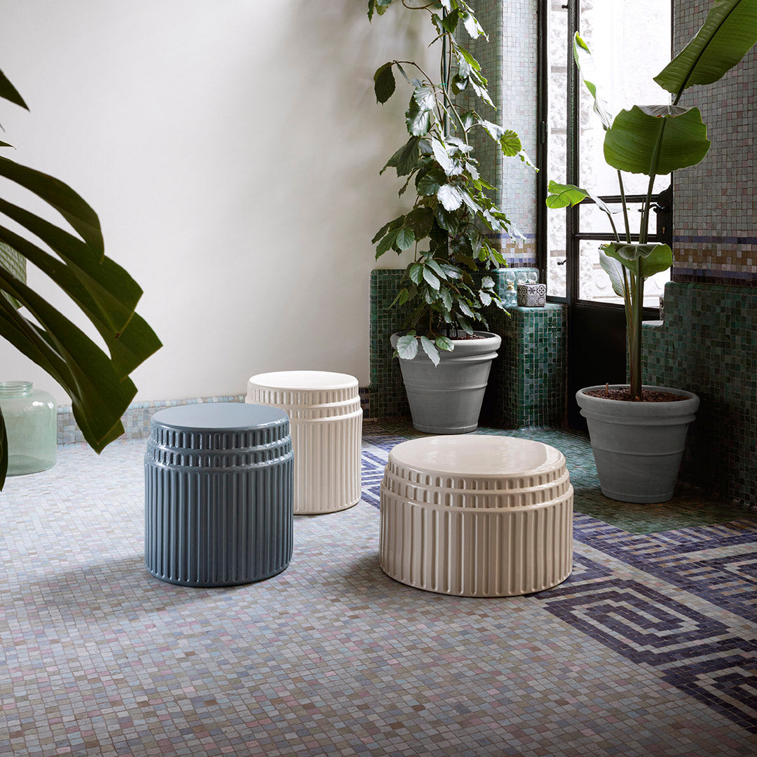 Kolos is formed in a plaster mould in a pottery where craftsmen apply the glaze and then fire the table. Although shiny and polished to the touch, the material it is made of is evident. The corners absorb less colour and become paler while the pigments are concentrated in the rounded areas, making them darker. Kolos therefore forms a highly decorative side table, combining its function as a furnishing accessory with an artistic value to form a showpiece. Its eccentric aesthetic represents an ironic interpretation of the architecture of the Colosseum.