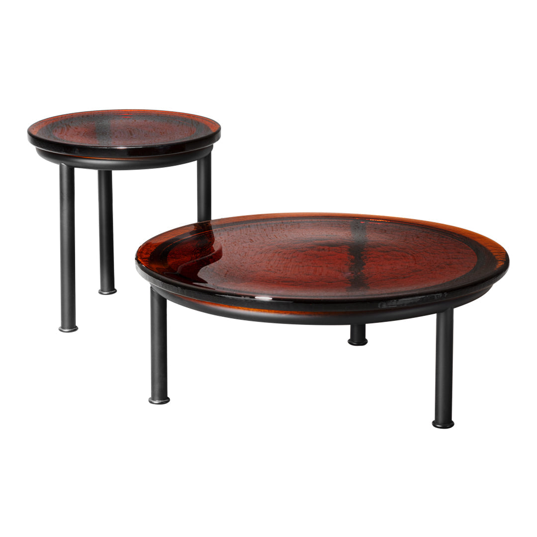 Coffee and side-table featured by a cast glass top with lacquered or zinc-coated metal structure. Glass Finishes available in amber and petrol green.